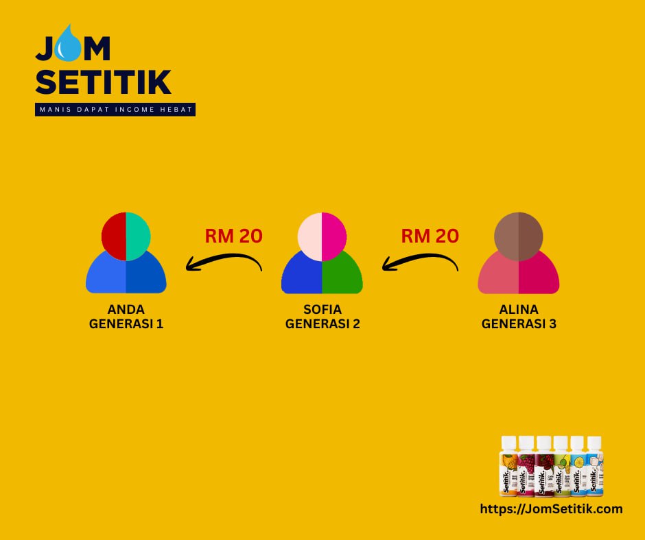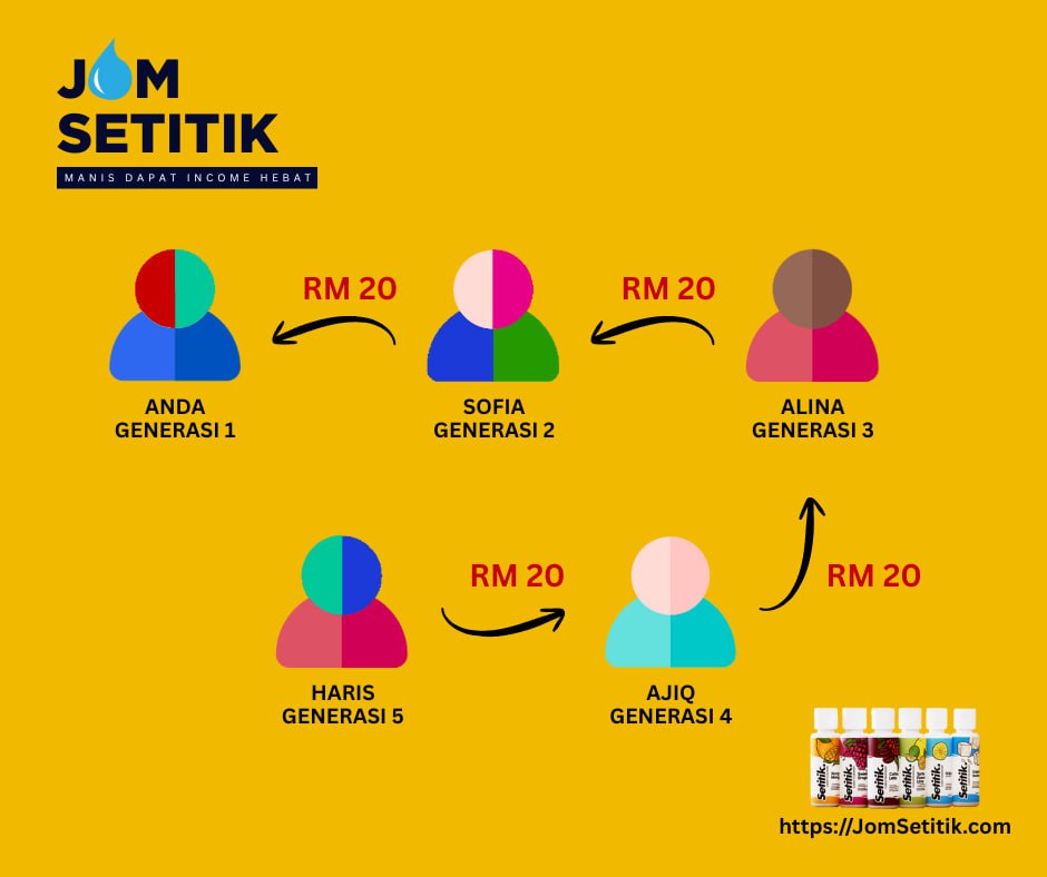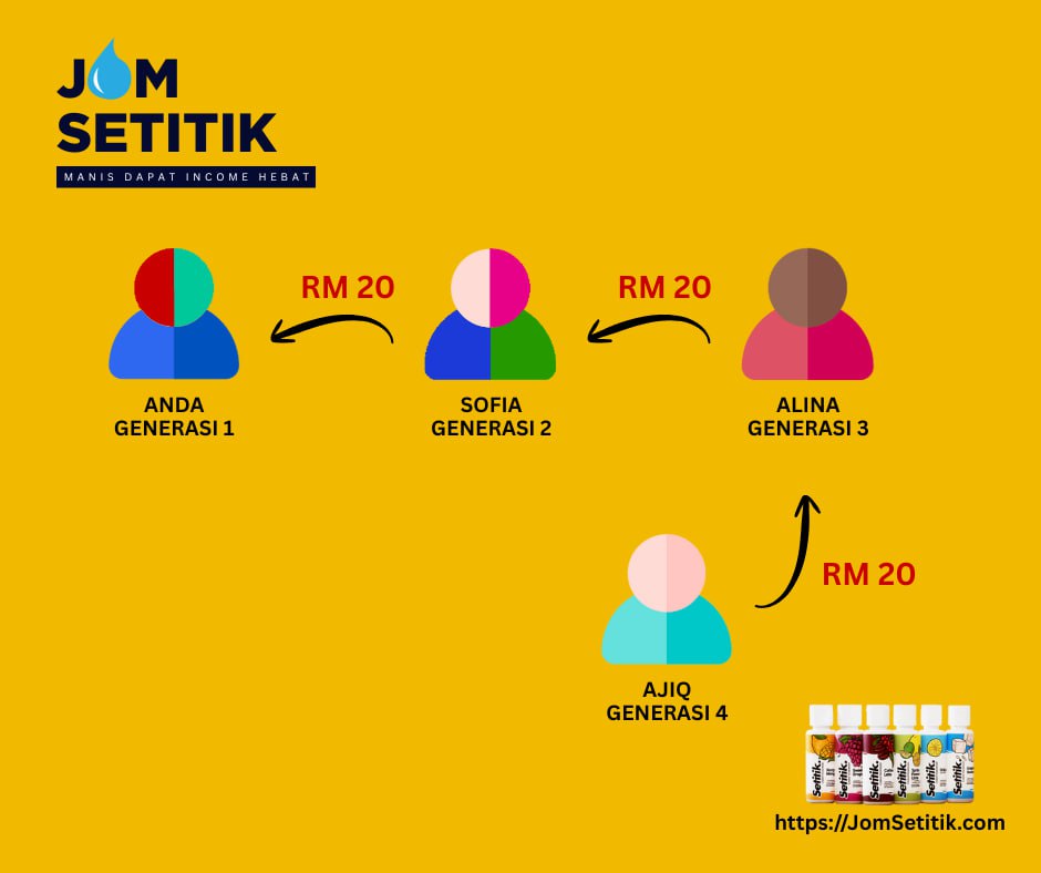Apabila Ajiq buat jualan kepada Haris, Ajiq akan terima RM20. Alina, Sofia dan ANDA juga terima RM20 kerana hasil jualan Ajiq (Generasi 4) anda.