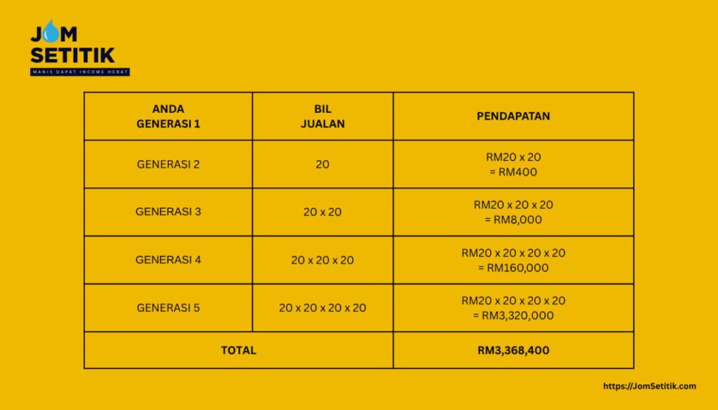 Apabila Super Affiliate Generasi 4 juga membuat jualan 20 set setiap orang, pendapatan anda dari jualan Generasi 5 ialah RM3,200,000.
